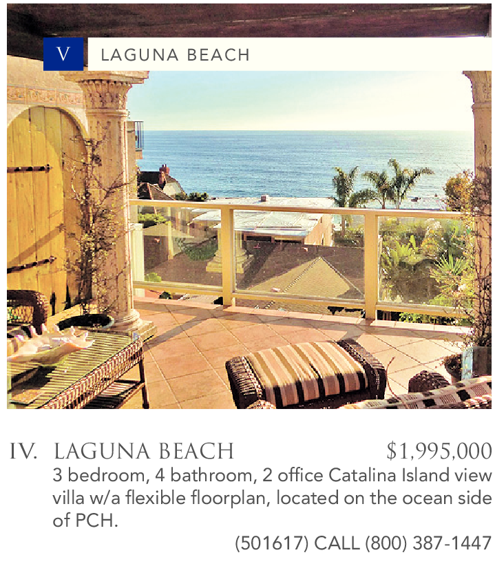 LAGUNA BEACH $1,995,000 3 bedroom, 4 bathroom, 2 office Catalina Island view villa w/a flexible floorplan, located on the ocean side of PCH.