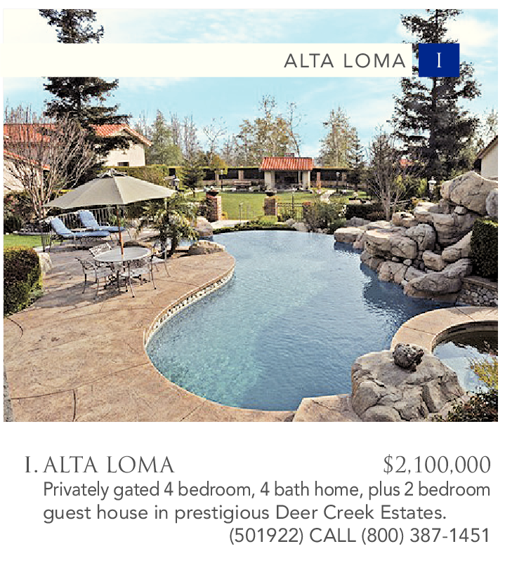 I. ALTA LOMA $2,100,000 Privately gated 4 bedroom, 4 bath home, plus 2 bedroom guest house in prestigious Deer Creek Estates.
