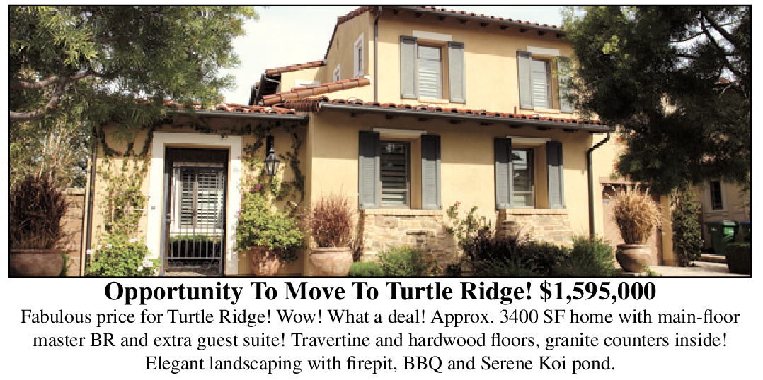 Opportunity To Move To Turtle Ridge! $1,595,000 Fabulous price for Turtle Ridge! Wow! What a deal! Approx. 3400 SF home with main-floor master BR and extra guest suite! Travertine and hardwood floors, granite counters inside! Elegant landscaping with firepit, BBQ and Serene Koi pond.