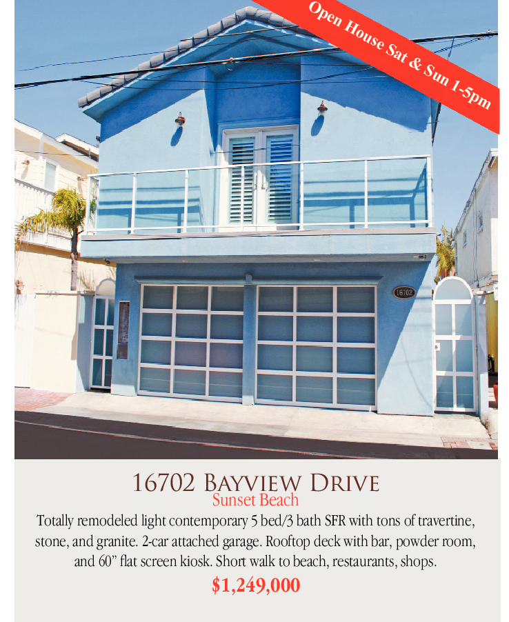 16702 Bayview Drive Sunset Beach Totally remodeled light contemporary 5 bed/3 bath SFR with tons of travertine, stone, and granite. 2-car attached garage. Rooftop deck with bar, powder room, and 60” flat screen kiosk. Short walk to beach, restaurants, shops.