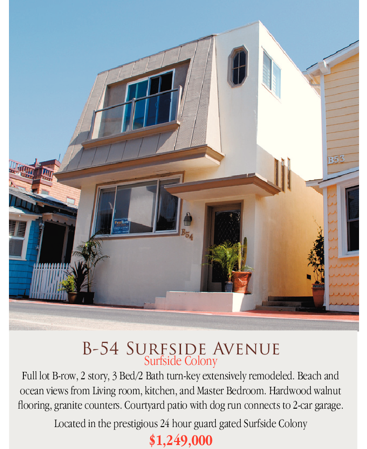 B-54 Surfside Avenue Surfside Colony Full lot B-row, 2 story, 3 Bed/2 Bath turn-key extensively remodeled. Beach and ocean views from Living room, kitchen, and Master Bedroom. Hardwood walnut flooring, granite counters. Courtyard patio with dog run connects to 2-car garage.