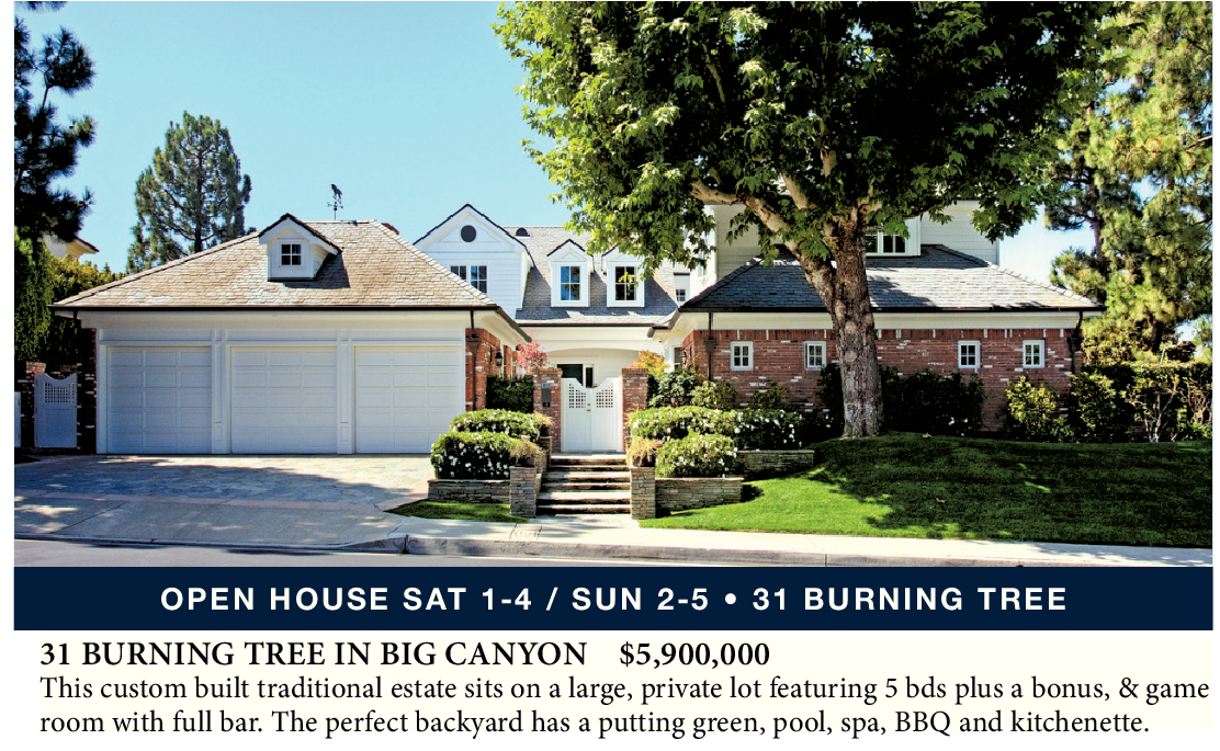 OPEN HOUSE SAT 1-4 / SUN 2-5 • 31 BURNING TREE 31 BURNING TREE IN BIG CANYON $5,900,000 This custom built traditional estate sits on a large, private lot featuring 5 bds plus a bonus, & game room with full bar. The perfect backyard has a putting green, pool, spa, BBQ and kitchenette.