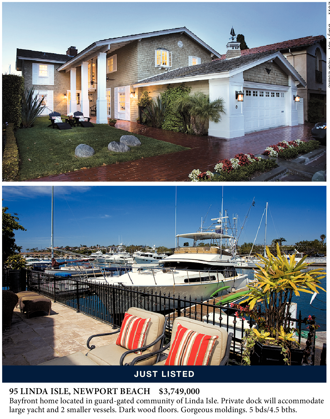 95 LINDA ISLE, NEWPORT BEACH $3,749,000 Bayfront home located in guard-gated community of Linda Isle. Private dock will accommodate large yacht and 2 smaller vessels. Dark wood floors. Gorgeous moldings. 5 bds/4.5 bths.