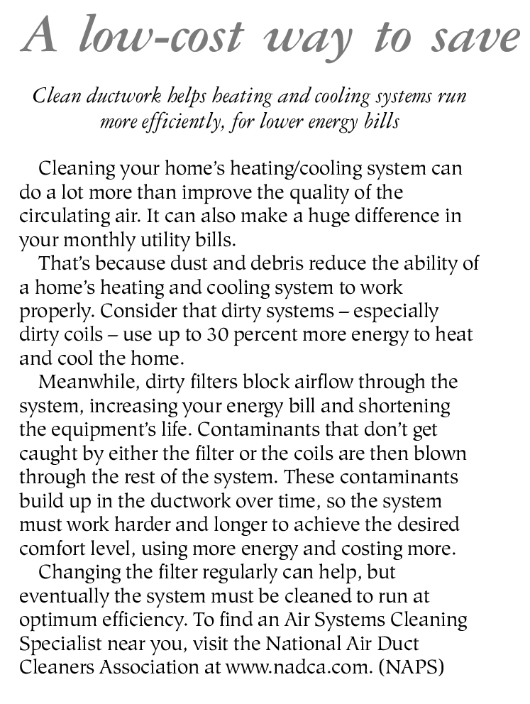 Changing the filter regularly can help, but eventually the system must be cleaned to run at optimum efficiency. To find an Air Systems Cleaning Specialist near you, visit the National Air Duct Cleaners Association at www.nadca.com. (NAPS)