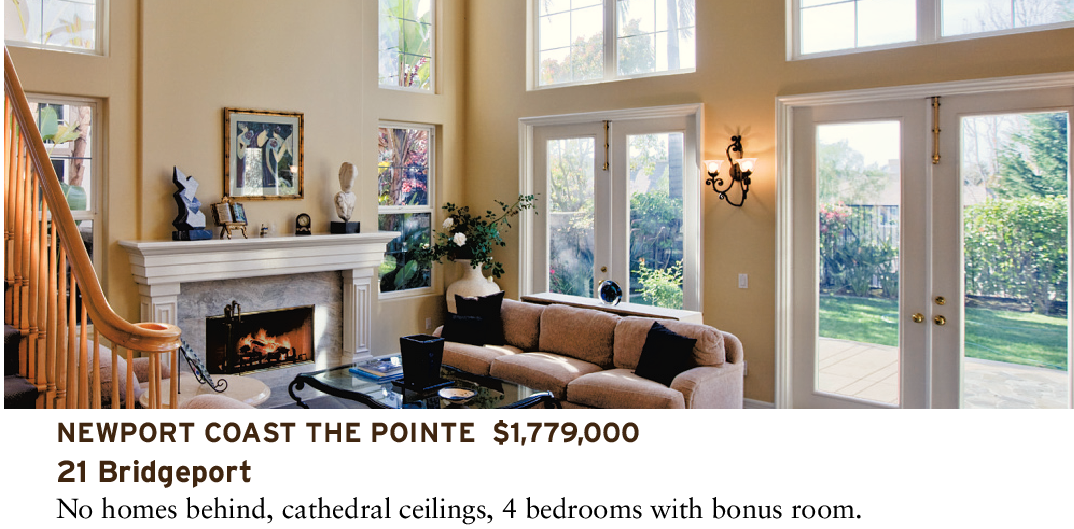 NEWPORT COAST THE POINTE $1,779,000 21 Bridgeport No homes behind, cathedral ceilings, 4 bedrooms with bonus room.