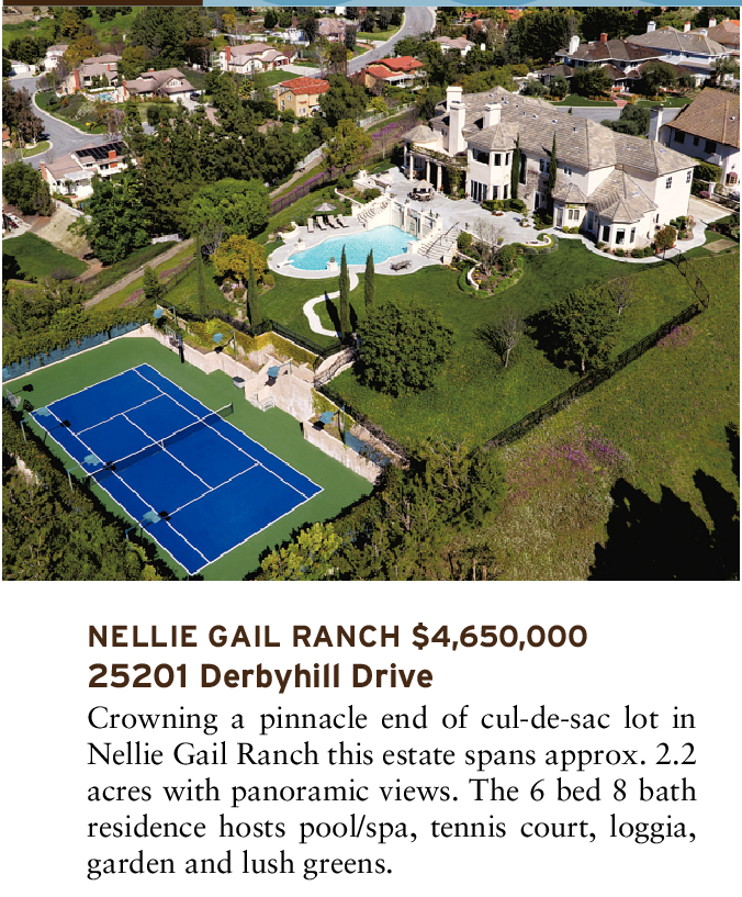 NELLIE GAIL RANCH $4,650,000 25201 Derbyhill Drive Crowning a pinnacle end of cul-de-sac lot in Nellie Gail Ranch this estate spans approx. 2.2 acres with panoramic views. The 6 bed 8 bath residence hosts pool/spa, tennis court, loggia, garden and lush greens.