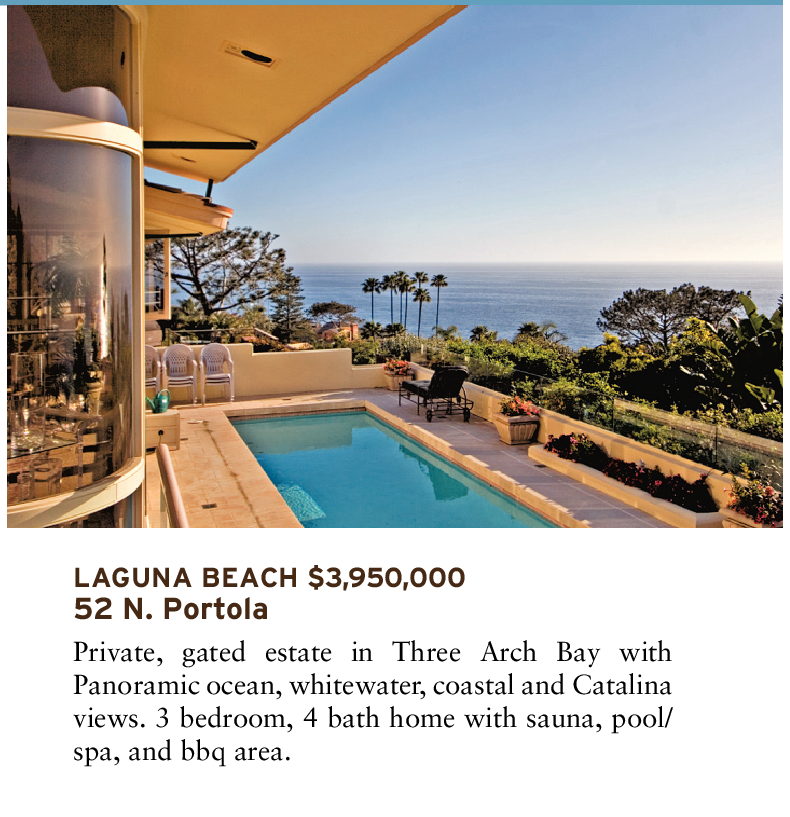 LAGUNA BEACH $3,950,000 52 N. Portola Private, gated estate in Three Arch Bay with Panoramic ocean, whitewater, coastal and Catalina views. 3 bedroom, 4 bath home with sauna, pool/ spa, and bbq area.