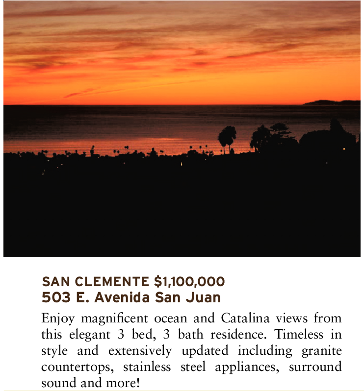 SAN CLEMENTE $1,100,000 503 E. Avenida San Juan Enjoy magnificent ocean and Catalina views from this elegant 3 bed, 3 bath residence. Timeless in style and extensively updated including granite countertops, stainless steel appliances, surround sound and more!
