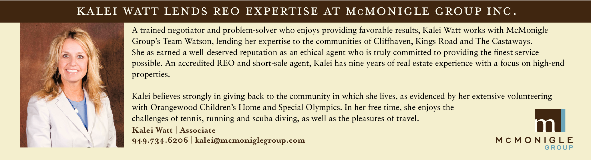 KALEI WATT LENDS REO EXPERTISE AT MCMONIGLE GROUP INC. A trained negotiator and problem-solver who enjoys providing favorable results, Kalei Watt works with McMonigle Group’s Team Watson, lending her expertise to the communities of Cliffhaven, Kings Road and The Castaways. She as earned a well-deserved reputation as an ethical agent who is truly committed to providing the finest service possible. An accredited REO and short-sale agent, Kalei has nine years of real estate experience with a focus on high-end properties. Kalei believes strongly in giving back to the community in which she lives, as evidenced by her extensive volunteering with Orangewood Children’s Home and Special Olympics. In her free time, she enjoys the challenges of tennis, running and scuba diving, as well as the pleasures of travel. Kalei Watt | Associate 949.734.6206 | kalei@mcmoniglegroup.com
