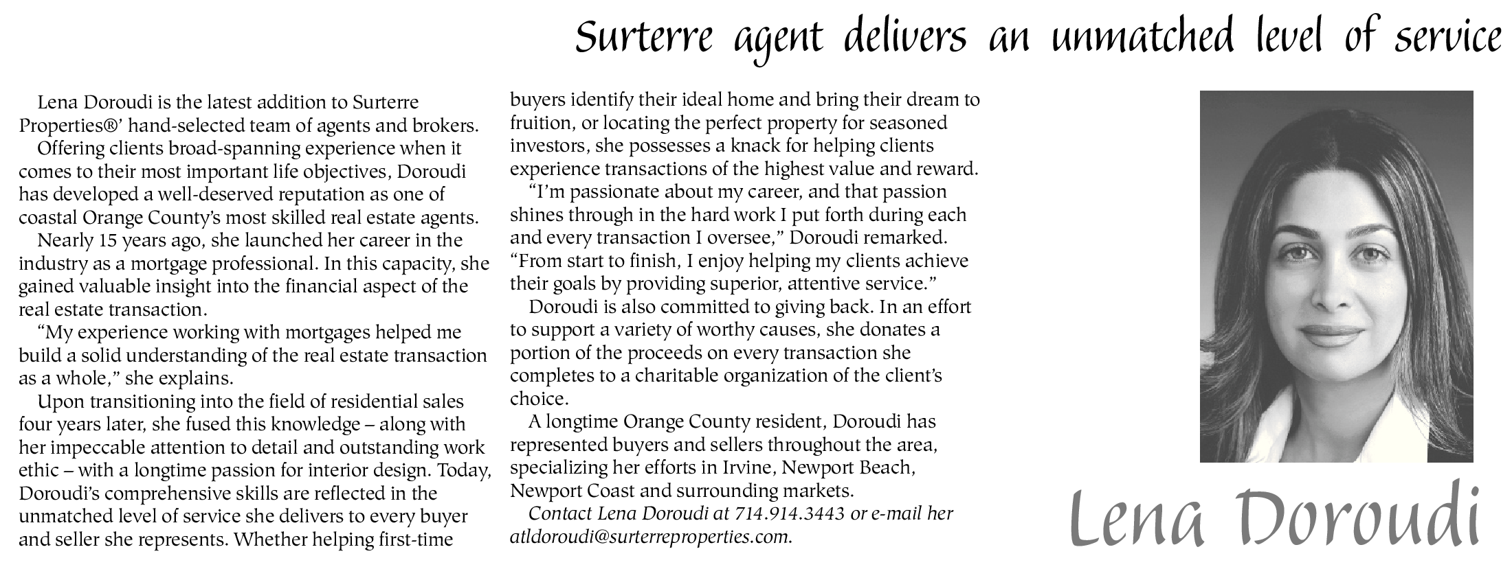 Contact Lena Doroudi at 714.914.3443 or e-mail her atldoroudi@surterreproperties.com.