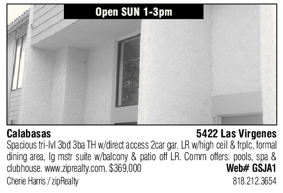 Open SUN 1-3pm Calabasas 5422 Las Virgenes Spacious tri-lvl 3bd 3ba TH w/direct access 2car gar. LR w/high ceil & frplc, formal dining area, lg mstr suite w/balcony & patio off LR. Comm offers: pools, spa & clubhouse. www.ziprealty.com. $369,000 Web# GSJA1 Cherie Harris / zipRealty 818.212.3654