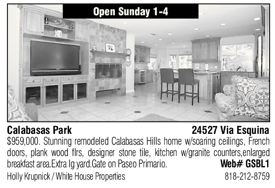 Open Sunday 1-4 Calabasas Park 24527 Via Esquina $959,000. Stunning remodeled Calabasas Hills home w/soaring ceilings, French doors, plank wood flrs, designer stone tile, kitchen w/granite counters,enlarged breakfast area.Extra lg yard.Gate on Paseo Primario. Web# GSBL1 Holly Krupnick / White House Properties 818-212-8759 See also