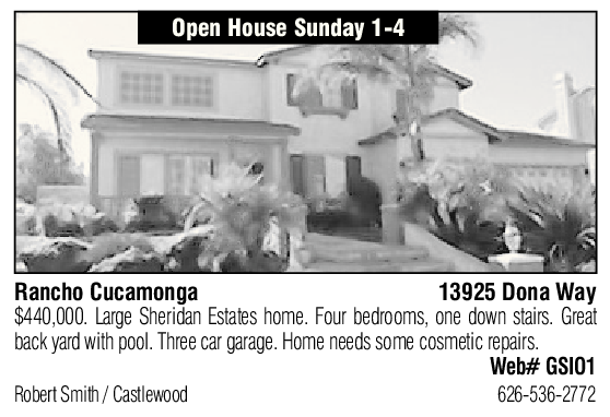 Rancho Cucamonga 13925 Dona Way $440,000. Large Sheridan Estates home. Four bedrooms, one down stairs. Great back yard with pool. Three car garage. Home needs some cosmetic repairs. Web# GSIO1 Robert Smith / Castlewood 626-536-2772