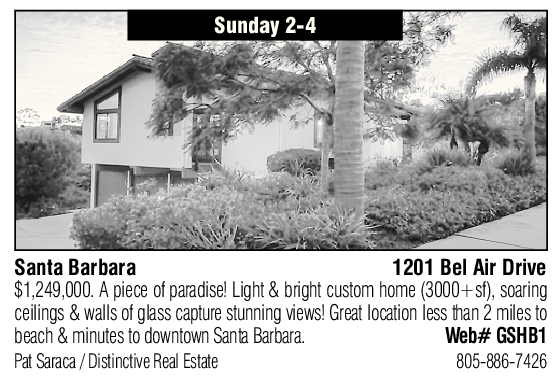 Sunday 2-4 Santa Barbara 1201 Bel Air Drive $1,249,000. A piece of paradise! Light & bright custom home (3000+sf), soaring ceilings & walls of glass capture stunning views! Great location less than 2 miles to beach & minutes to downtown Santa Barbara. Web# GSHB1 Pat Saraca / Distinctive Real Estate 805-886-7426