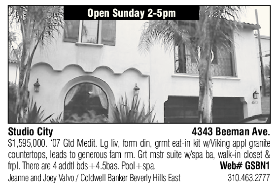 Open Sunday 2-5pm Studio City 4343 Beeman Ave. countertops, leads to generous fam rm. Grt mstr suite w/spa ba, walk-in closet & $1,595,000. ‘07 Gtd Medit. Lg liv, form din, grmt eat-in kit w/Viking appl granite frpl. There are 4 addtl bds+4.5bas. Pool+spa. Web# GSBN1 Jeanne and Joey Valvo / Coldwell Banker Beverly Hills East 310.463.2777 See also