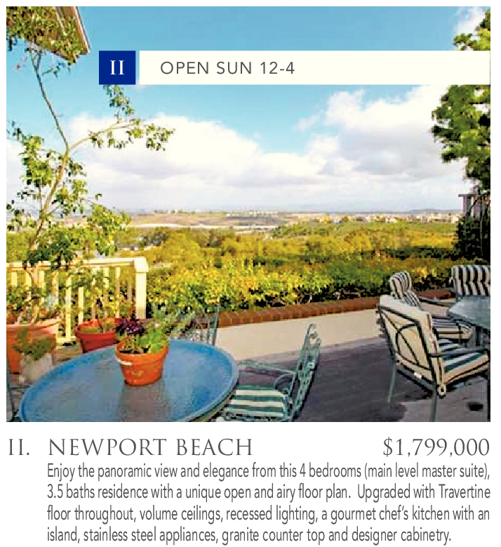 II. NEWPORT BEACH $1,799,000 Enjoy the panoramic view and elegance from this 4 bedrooms (main level master suite), 3.5 baths residence with a unique open and airy floor plan. Upgraded with Travertine floor throughout, volume ceilings, recessed lighting, a gourmet chef’s kitchen with an island, stainless steel appliances, granite counter top and designer cabinetry.