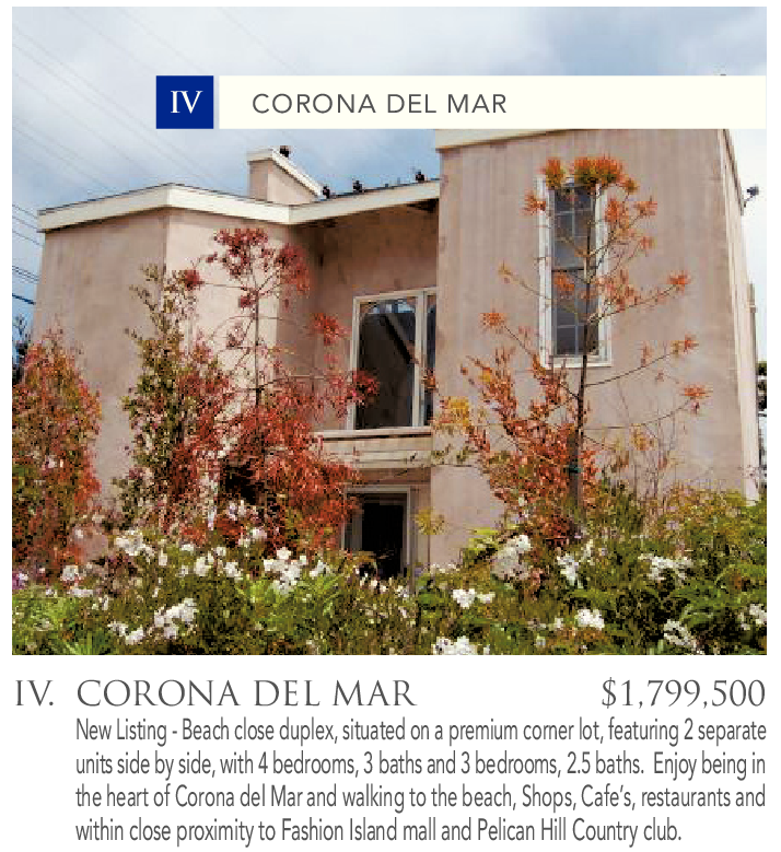 IV CORONA DEL MAR IV. CORONA DEL MAR $1,799,500 New Listing - Beach close duplex, situated on a premium corner lot, featuring 2 separate units side by side, with 4 bedrooms, 3 baths and 3 bedrooms, 2.5 baths. Enjoy being in the heart of Corona del Mar and walking to the beach, Shops, Cafe’s, restaurants and within close proximity to Fashion Island mall and Pelican Hill Country club.