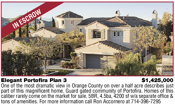 Elegant Portofira Plan 3 $1,425,000 One of the most dramatic view in Orange County on over a half acre describes just part of this magnificent home. Guard gated community of Portofira. Homes of this caliber rarely come on the market for sale. 5BR, 4.5ba, 4200 sf w/a separate office & tons of amenities. For more information call Ron Accornero at 714-396-7295