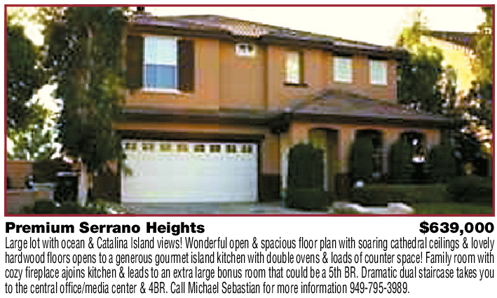 Premium Serrano Heights $639,000 Large lot with ocean & Catalina Island views! Wonderful open & spacious floor plan with soaring cathedral ceilings & lovely hardwood floors opens to a generous gourmet island kitchen with double ovens & loads of counter space! Family room with cozy fireplace ajoins kitchen & leads to an extra large bonus room that could be a 5th BR. Dramatic dual staircase takes you to the central office/media center & 4BR. Call Michael Sebastian for more information 949-795-3989.