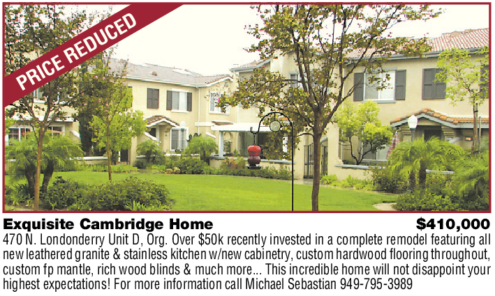 Exquisite Cambridge Home $410,000 470 N. Londonderry Unit D, Org. Over $50k recently invested in a complete remodel featuring all new leathered granite & stainless kitchen w/new cabinetry, custom hardwood flooring throughout, custom fp mantle, rich wood blinds & much more... This incredible home will not disappoint your highest expectations! For more information call Michael Sebastian 949-795-3989