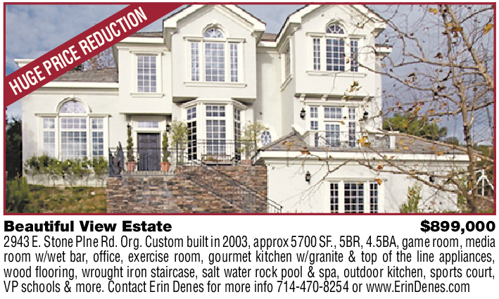Beautiful View Estate $899,000 2943 E. Stone PIne Rd. Org. Custom built in 2003, approx 5700 SF., 5BR, 4.5BA, game room, media room w/wet bar, office, exercise room, gourmet kitchen w/granite & top of the line appliances, wood flooring, wrought iron staircase, salt water rock pool & spa, outdoor kitchen, sports court, VP schools & more. Contact Erin Denes for more info 714-470-8254 or www.ErinDenes.com