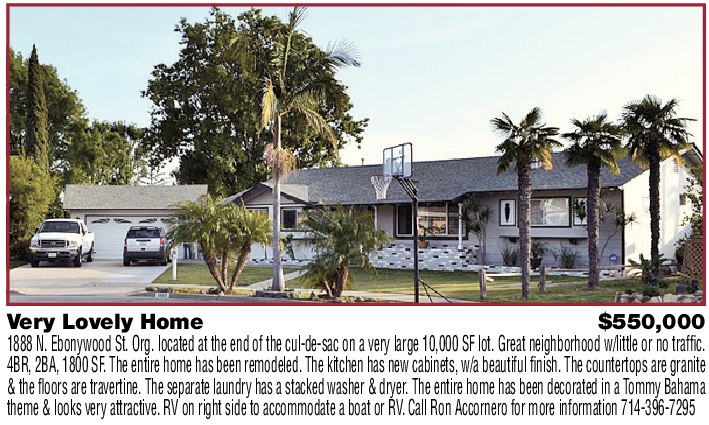 Very Lovely Home $550,000 1888 N. Ebonywood St. Org. located at the end of the cul-de-sac on a very large 10,000 SF lot. Great neighborhood w/little or no traffic. 4BR, 2BA, 1800 SF. The entire home has been remodeled. The kitchen has new cabinets, w/a beautiful finish. The countertops are granite & the floors are travertine. The separate laundry has a stacked washer & dryer. The entire home has been decorated in a Tommy Bahama theme & looks very attractive. RV on right side to accommodate a boat or RV. Call Ron Accornero for more information 714-396-7295