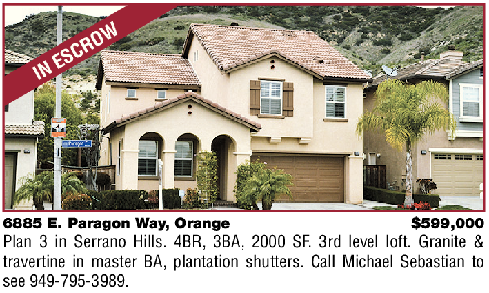6885 E. Paragon Way, Orange $599,000 Plan 3 in Serrano Hills. 4BR, 3BA, 2000 SF. 3rd level loft. Granite & travertine in master BA, plantation shutters. Call Michael Sebastian to see 949-795-3989.
