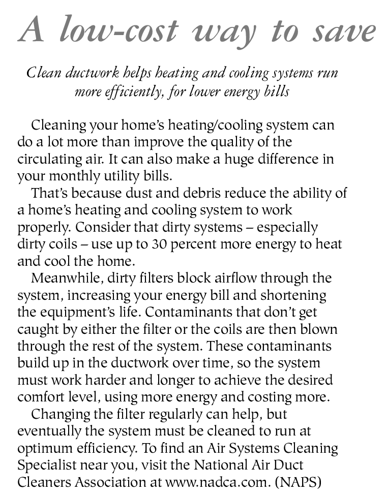 Changing the filter regularly can help, but eventually the system must be cleaned to run at optimum efficiency. To find an Air Systems Cleaning Specialist near you, visit the National Air Duct Cleaners Association at www.nadca.com. (NAPS)