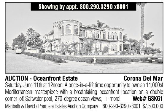 Showing by appt. 800.290.3290 x8001 AUCTION - Oceanfront Estate Corona Del Mar Saturday, June 11th at 12noon: A once-in-a-lifetime opportunity to own an 11,000sf Mediterranean masterpiece with a breathtaking oceanfront location on a double corner lot! Saltwater pool, 270-degree ocean views, + more! Web# GSKG1 Maribeth & David / Premiere Estates Auction Company 800-290-3290 x8001 $7,500,000