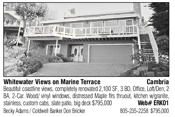 Whitewater Views on Marine Terrace Cambria Beautiful coastline views, completely renovated 2,100 SF, 3 BD, Office, Loft/Den, 2 BA, 2-Car. Wood/ vinyl windows, distressed Maple flrs thruout, kitchen w/granite, stainless, custom cabs, slate patio, big deck $795,000 Web# ERKO1 Becky Adams / Coldwell Banker Don Bricker 805-235-2258 $795,000