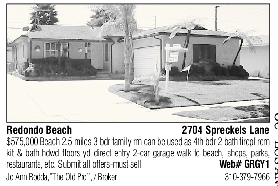 Redondo Beach 2704 Spreckels Lane $575,000 Beach 2.5 miles 3 bdr family rm can be used as 4th bdr 2 bath firepl rem kit & bath hdwd floors yd direct entry 2-car garage walk to beach, shops, parks, restaurants, etc. Submit all offers-must sell Web# GRGY1 Jo Ann Rodda,”The Old Pro”, / Broker 310-379-7966