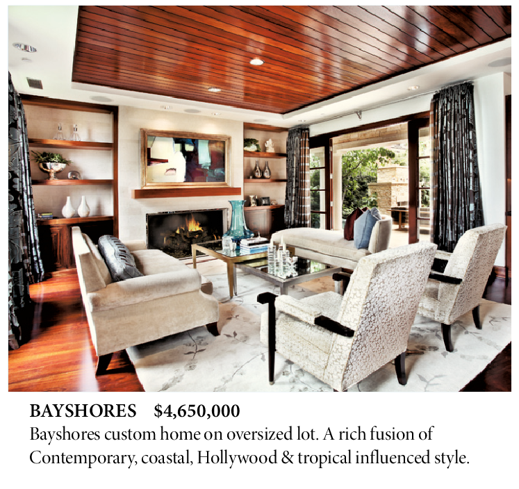 BAYSHORES $4,650,000 Bayshores custom home on oversized lot. A rich fusion of Contemporary, coastal, Hollywood & tropical influenced style.