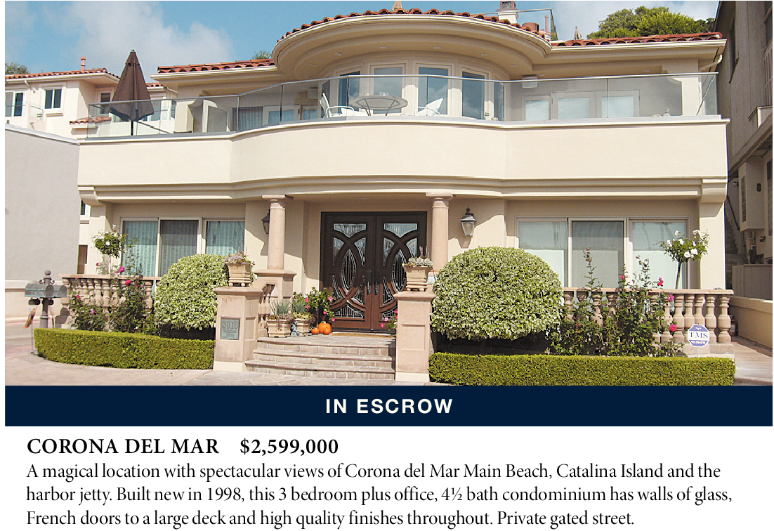 CORONA DEL MAR $2,599,000 A magical location with spectacular views of Corona del Mar Main Beach, Catalina Island and the harbor jetty. Built new in 1998, this 3 bedroom plus office, 4½ bath condominium has walls of glass, French doors to a large deck and high quality finishes throughout. Private gated street.