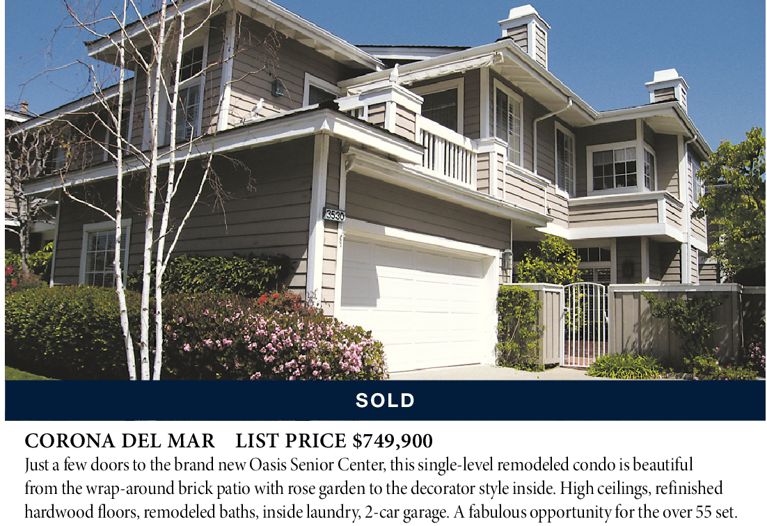 CORONA DEL MAR LIST PRICE $749,900 Just a few doors to the brand new Oasis Senior Center, this single-level remodeled condo is beautiful from the wrap-around brick patio with rose garden to the decorator style inside. High ceilings, refinished hardwood floors, remodeled baths, inside laundry, 2-car garage. A fabulous opportunity for the over 55 set.