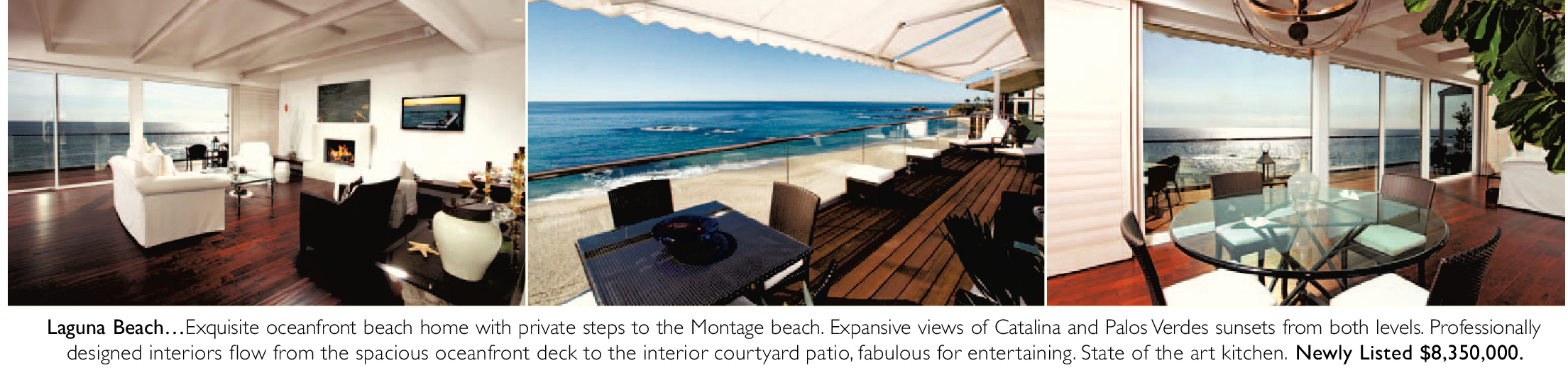 Laguna Beach…Exquisite oceanfront beach home with private steps to the Montage beach. Expansive views of Catalina and Palos Verdes sunsets from both levels. Professionally designed interiors flow from the spacious oceanfront deck to the interior courtyard patio, fabulous for entertaining. State of the art kitchen. Newly Listed $8,350,000.