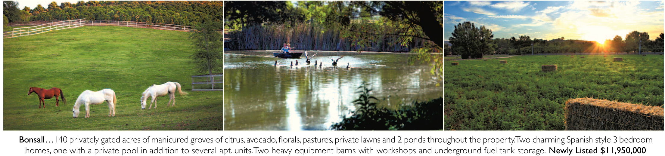 Bonsall…140 privately gated acres of manicured groves of citrus, avocado, florals, pastures, private lawns and 2 ponds throughout the property.Two charming Spanish style 3 bedroom homes, one with a private pool in addition to several apt. units.Two heavy equipment barns with workshops and underground fuel tank storage. Newly Listed $11,950,000