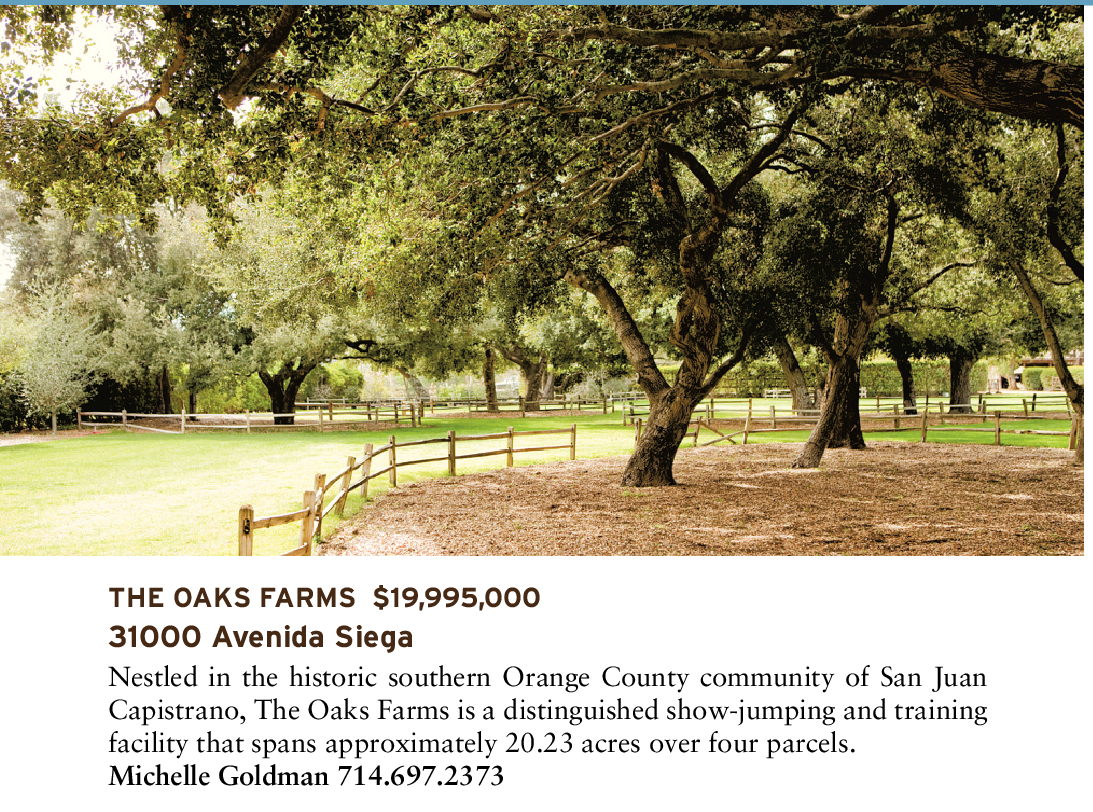 THE OAKS FARMS $19,995,000 31000 Avenida Siega Nestled in the historic southern Orange County community of San Juan Capistrano, The Oaks Farms is a distinguished show-jumping and training facility that spans approximately 20.23 acres over four parcels. Michelle Goldman 714.697.2373