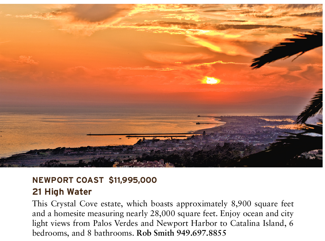 NEWPORT COAST $11,995,000 21 High Water This Crystal Cove estate, which boasts approximately 8,900 square feet and a homesite measuring nearly 28,000 square feet. Enjoy ocean and city light views from Palos Verdes and Newport Harbor to Catalina Island, 6 bedrooms, and 8 bathrooms. Rob Smith 949.697.8855