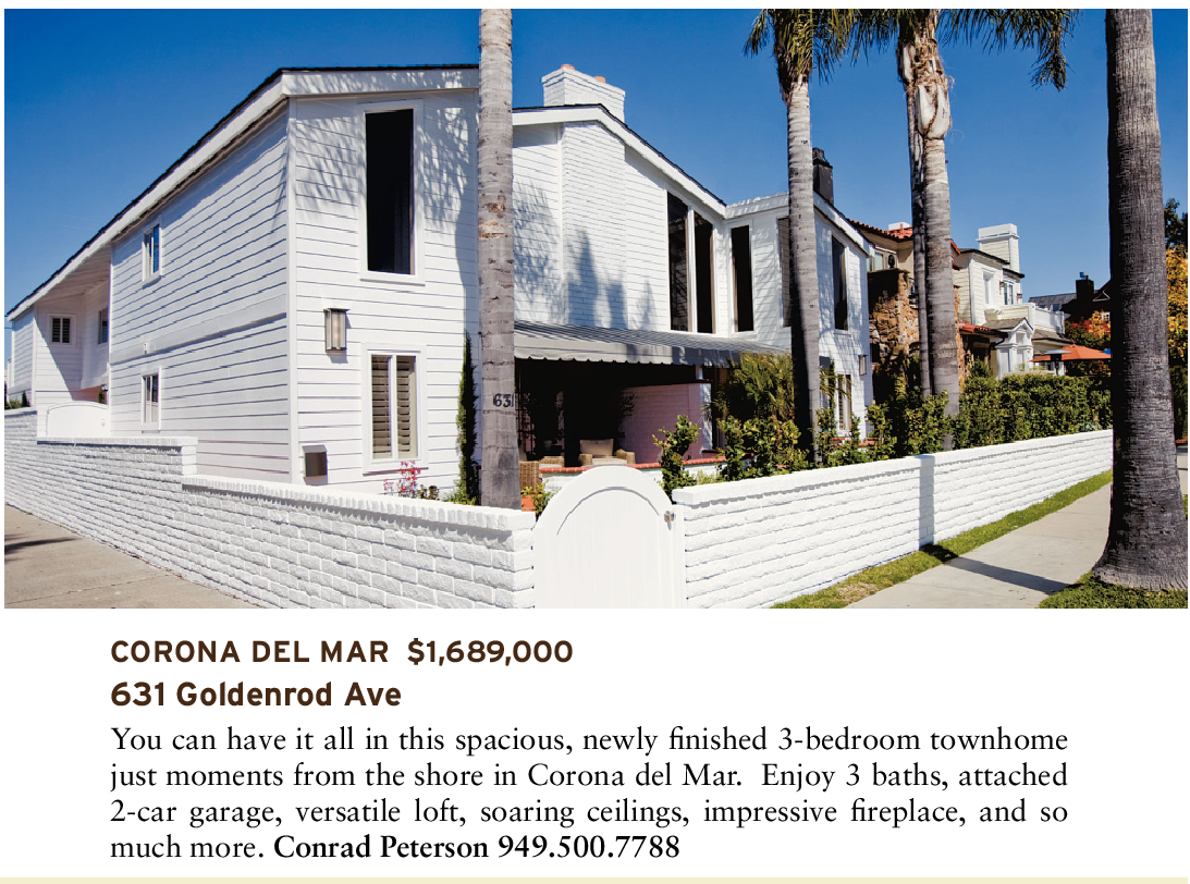 CORONA DEL MAR $1,689,000 631 Goldenrod Ave You can have it all in this spacious, newly finished 3-bedroom townhome just moments from the shore in Corona del Mar. Enjoy 3 baths, attached 2-car garage, versatile loft, soaring ceilings, impressive fireplace, and so much more. Conrad Peterson 949.500.7788