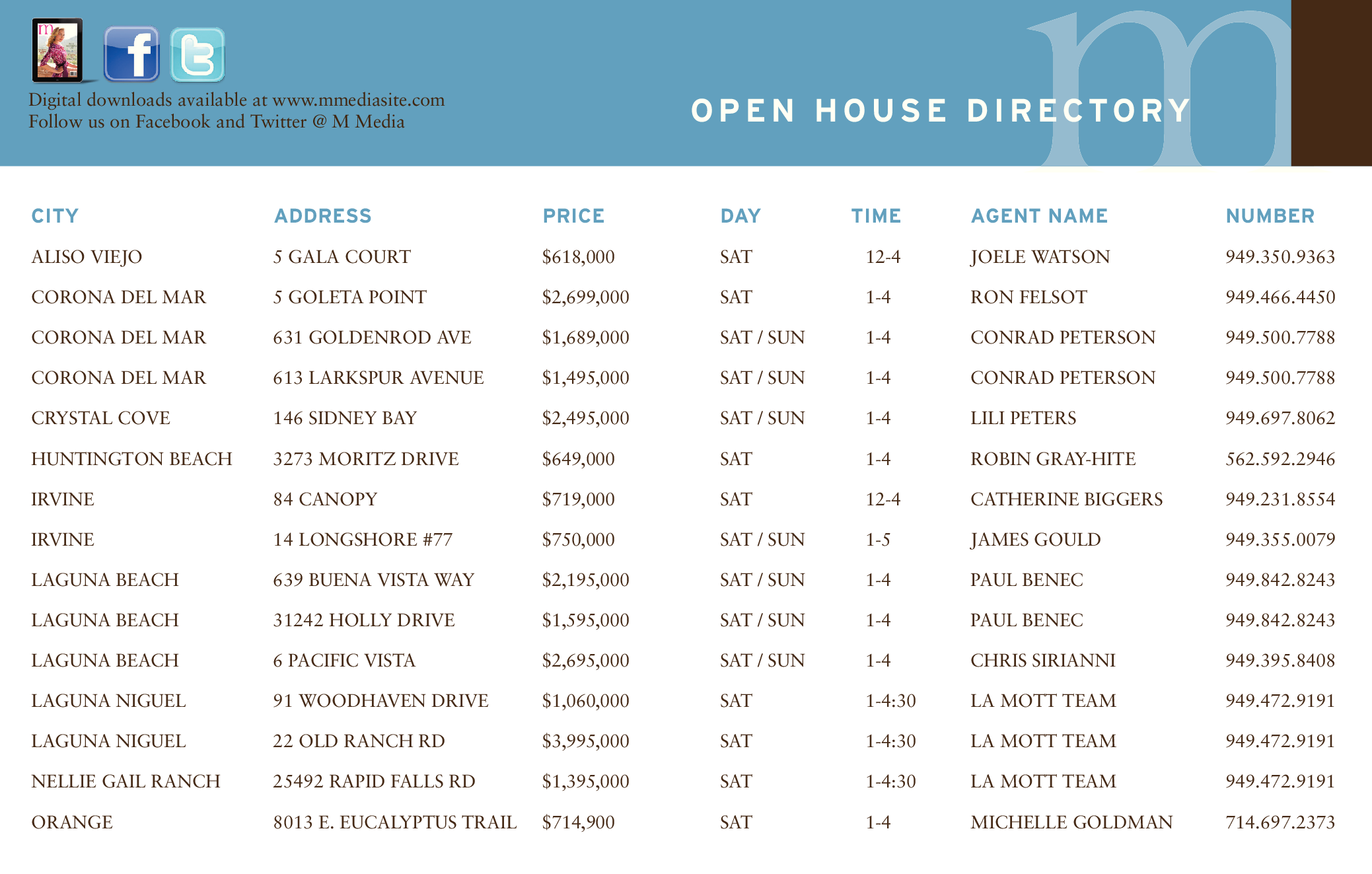 Digital downloads available at www.mmediasite.com Follow us on Facebook and Twitter @ M Media CITY ALISO VIEJO CORONA DEL MAR CORONA DEL MAR CORONA DEL MAR CRYSTAL COVE HUNTINGTON BEACH IRVINE IRVINE LAGUNA BEACH LAGUNA BEACH LAGUNA BEACH LAGUNA NIGUEL LAGUNA NIGUEL NELLIE GAIL RANCH ORANGE ADDRESS 5 GALA COURT 5 GOLETA POINT 631 GOLDENROD AVE 613 LARKSPUR AVENUE 146 SIDNEY BAY 3273 MORITZ DRIVE 84 CANOPY 14 LONGSHORE #77 639 BUENA VISTA WAY 31242 HOLLY DRIVE 6 PACIFIC VISTA 91 WOODHAVEN DRIVE 22 OLD RANCH RD 25492 RAPID FALLS RD 8013 E. EUCALYPTUS TRAIL PRICE $618,000 $2,699,000 $1,689,000 $1,495,000 $2,495,000 $649,000 $719,000 $750,000 $2,195,000 $1,595,000 $2,695,000 $1,060,000 $3,995,000 $1,395,000 $714,900 O P E N H O U S E D I R EC TO RY DAY TIME SAT 12-4 SAT 1-4 SAT / SUN 1-4 SAT / SUN 1-4 SAT / SUN 1-4 SAT 1-4 SAT 12-4 SAT / SUN 1-5 SAT / SUN 1-4 SAT / SUN 1-4 SAT / SUN 1-4 SAT 1-4:30 SAT 1-4:30 SAT 1-4:30 SAT 1-4 AGENT NAME JOELE WATSON RON FELSOT CONRAD PETERSON CONRAD PETERSON LILI PETERS ROBIN GRAY-HITE CATHERINE BIGGERS JAMES GOULD PAUL BENEC PAUL BENEC CHRIS SIRIANNI LA MOTT TEAM LA MOTT TEAM LA MOTT TEAM MICHELLE GOLDMAN NUMBER 949.350.9363 949.466.4450 949.500.7788 949.500.7788 949.697.8062 562.592.2946 949.231.8554 949.355.0079 949.842.8243 949.842.8243 949.395.8408 949.472.9191 949.472.9191 949.472.9191 714.697.2373