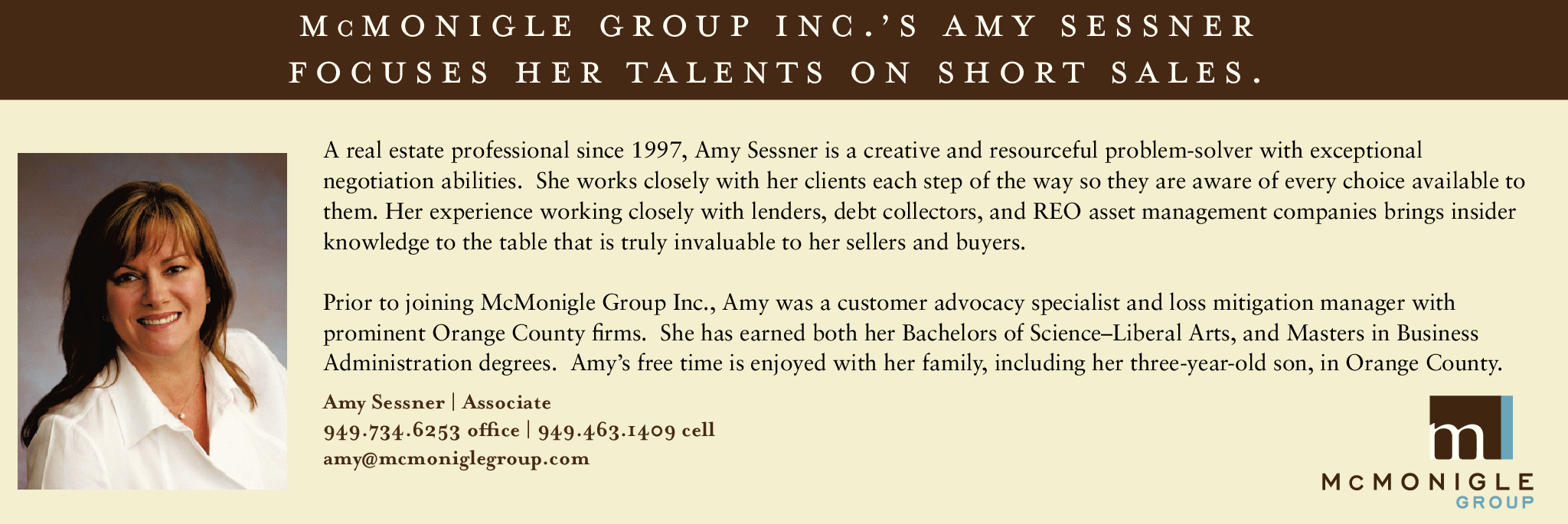 M C M O N I G L E G R O U P I N C .’ S A M Y S E S S N E R F O C U S E S H E R T A L E N T S O N S H O R T S A L E S . A real estate professional since 1997, Amy Sessner is a creative and resourceful problem-solver with exceptional negotiation abilities. She works closely with her clients each step of the way so they are aware of every choice available to them. Her experience working closely with lenders, debt collectors, and REO asset management companies brings insider knowledge to the table that is truly invaluable to her sellers and buyers. Prior to joining McMonigle Group Inc., Amy was a customer advocacy specialist and loss mitigation manager with prominent Orange County firms. She has earned both her Bachelors of Science–Liberal Arts, and Masters in Business Administration degrees. Amy’s free time is enjoyed with her family, including her three-year-old son, in Orange County. Amy Sessner | Associate 949.734.6253 office | 949.463.1409 cell amy@mcmoniglegroup.com