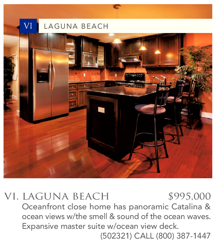 VI. LAGUNA BEACH $995,000 Oceanfront close home has panoramic Catalina & ocean views w/the smell & sound of the ocean waves. Expansive master suite w/ocean view deck.