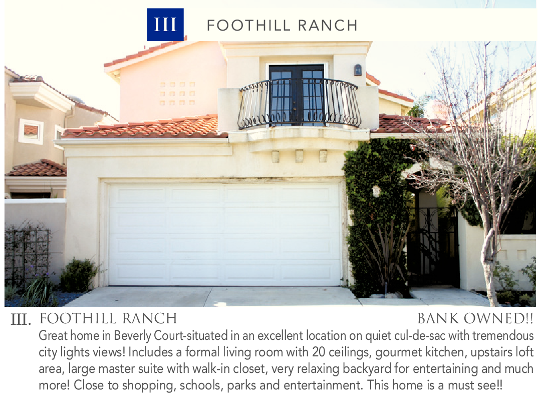 FOOTHILL RANCH BANK OWNED!! Great home in Beverly Court-situated in an excellent location on quiet cul-de-sac with tremendous city lights views! Includes a formal living room with 20 ceilings, gourmet kitchen, upstairs loft area, large master suite with walk-in closet, very relaxing backyard for entertaining and much more! Close to shopping, schools, parks and entertainment. This home is a must see!!