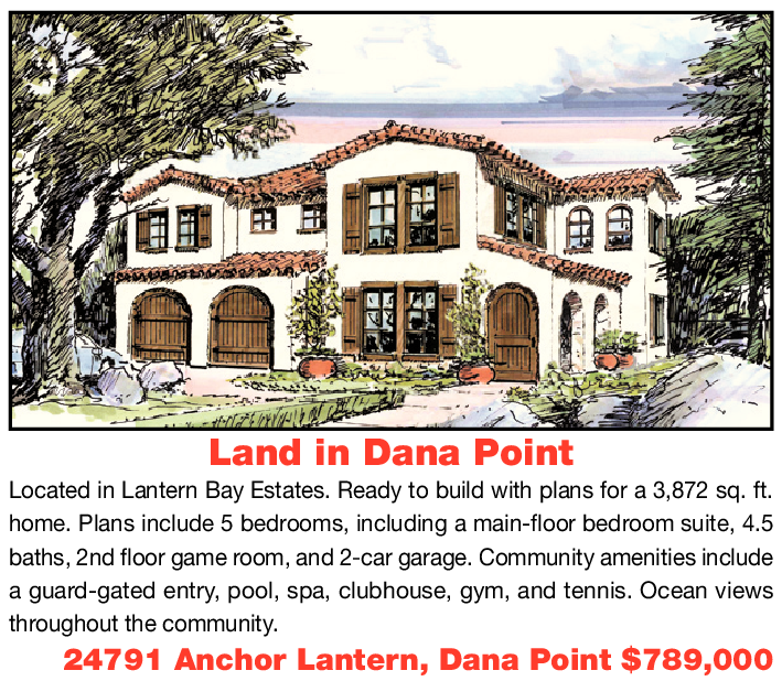 Land in Dana Point Located in Lantern Bay Estates. Ready to build with plans for a 3,872 sq. ft. home. Plans include 5 bedrooms, including a main-floor bedroom suite, 4.5 baths, 2nd floor game room, and 2-car garage. Community amenities include a guard-gated entry, pool, spa, clubhouse, gym, and tennis. Ocean views throughout the community. 24791 Anchor Lantern, Dana Point $789,000