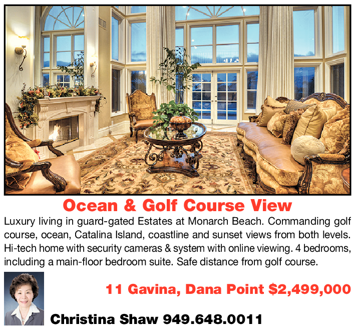 Ocean & Golf Course View Luxury living in guard-gated Estates at Monarch Beach. Commanding golf course, ocean, Catalina Island, coastline and sunset views from both levels. Hi-tech home with security cameras & system with online viewing. 4 bedrooms, including a main-floor bedroom suite. Safe distance from golf course. 11 Gavina, Dana Point $2,499,000 Christina Shaw 949.648.0011