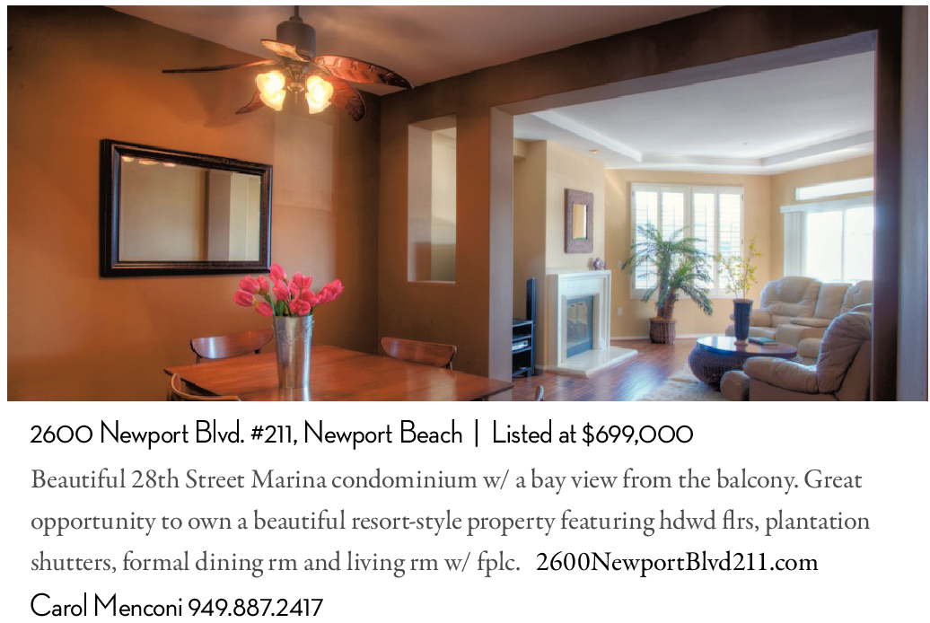 Beautiful28thStreetMarinacondominiumw/abayviewfromthebalcony.Great opportunity to own a beautiful resort-style property featuring hdwd flrs, plantation shutters, formal dining rm and living rm w/ fplc. 2600NewportBlvd211.com Carol Menconi 949.887.2417