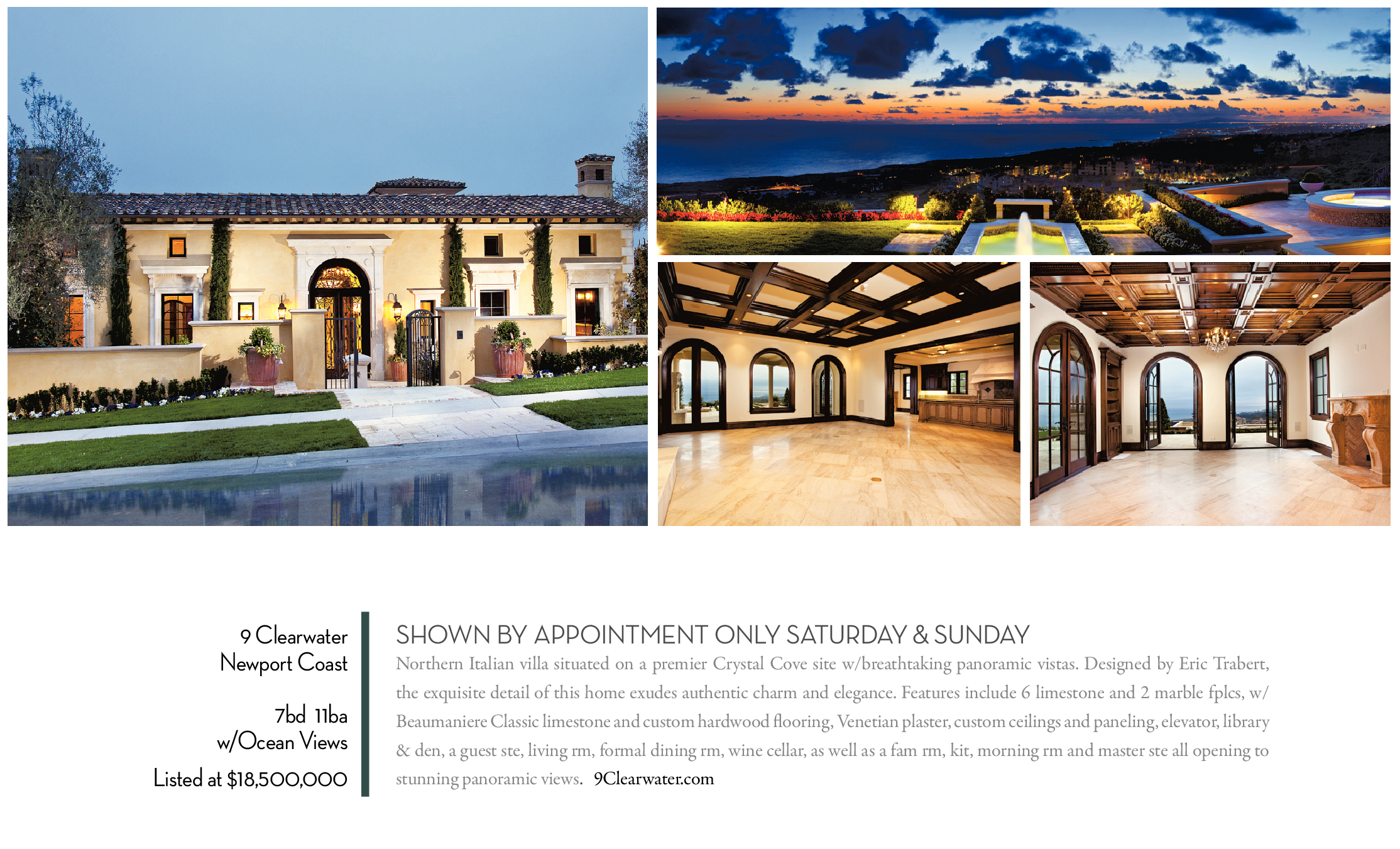 Northern Italian villa situated on a premier Crystal Cove site w/breathtaking panoramic vistas. Designed by Eric Trabert,