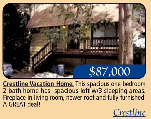 Crestline Vacation Home. This spacious one bedroom 2 bath home has spacious loft w/3 sleeping areas. Fireplace in living room, newer roof and fully furnished. A GREAT deal!