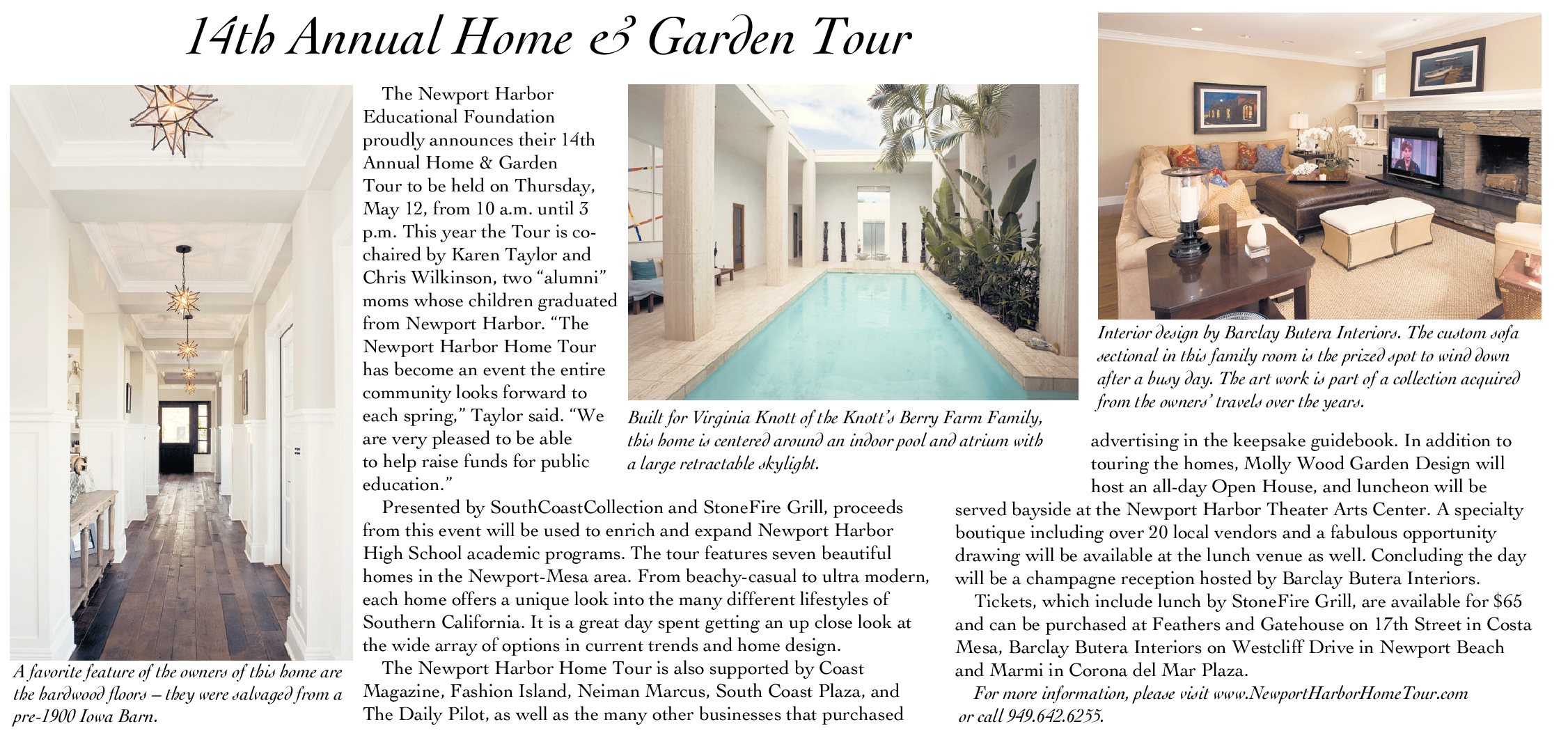 The Newport Harbor Home Tour is also supported by Coast Magazine, Fashion Island, Neiman Marcus, South Coast Plaza, and The Daily Pilot, as well as the many other businesses that purchased