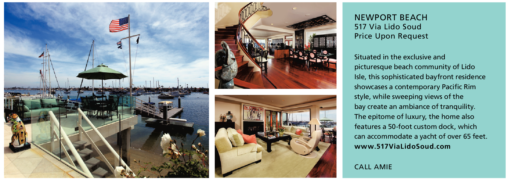NEWPORT BEACH 517 Via Lido Soud Price Upon Request Situated in the exclusive and picturesque beach community of Lido Isle, this sophisticated bayfront residence showcases a contemporary Pacific Rim style, while sweeping views of the bay create an ambiance of tranquility. The epitome of luxury, the home also features a 50-foot custom dock, which can accommodate a yacht of over 65 feet. www.517ViaLidoSoud.com CALL AMIE